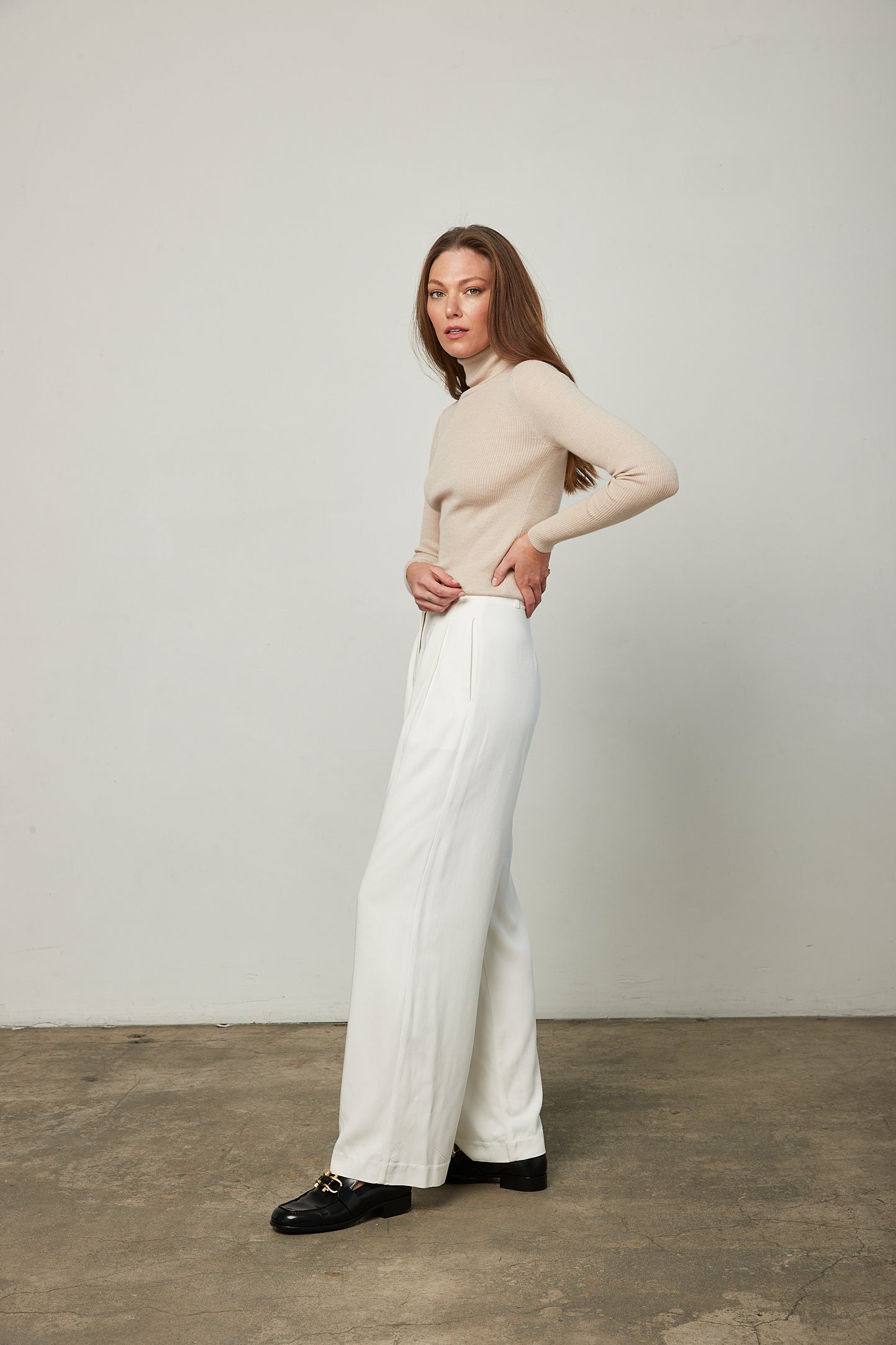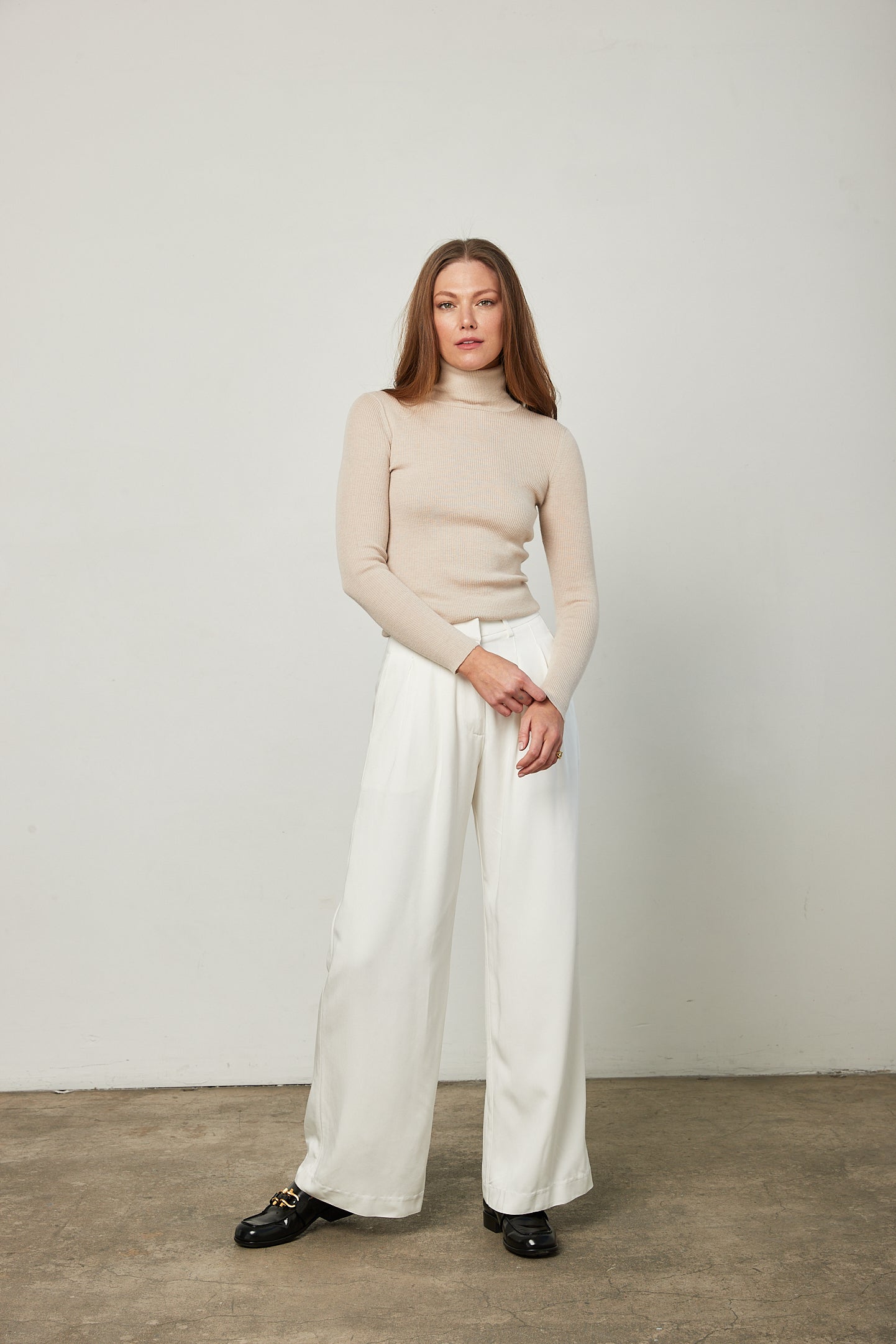 Your wardrobe staple is the Nicole Cashmere Turtleneck in Oyster. Lightweight and super soft, this sweater will pair with all of your elevated essentials.