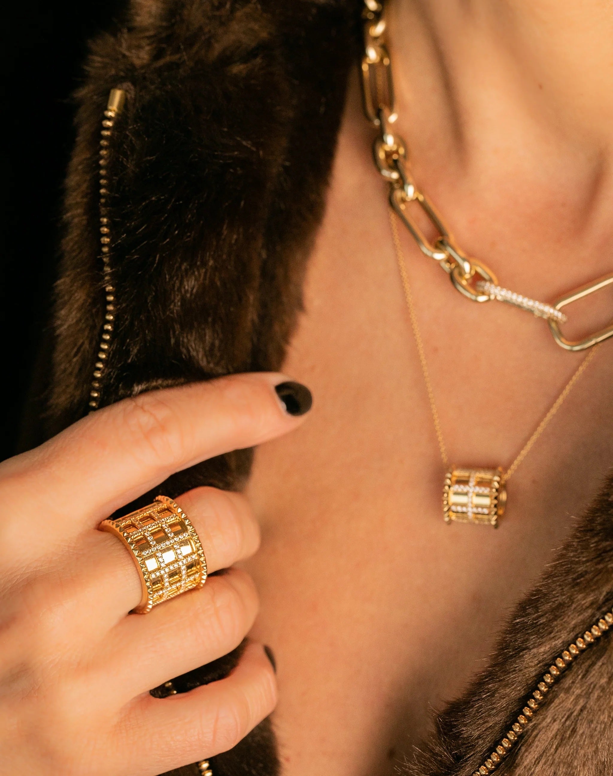 Rolling chain through pendant with spike borders and cross section set diamonds.