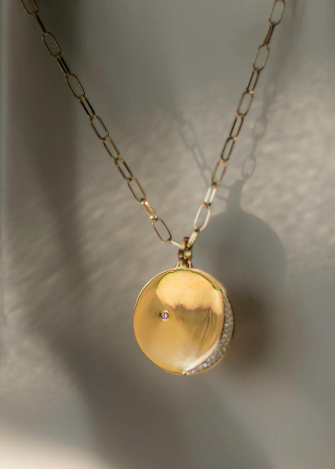 - double-sided, diamond moon on one side, matte gold moon on the reverse