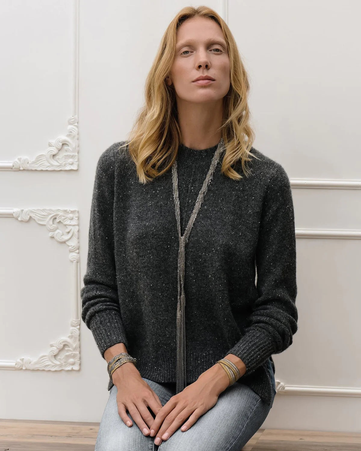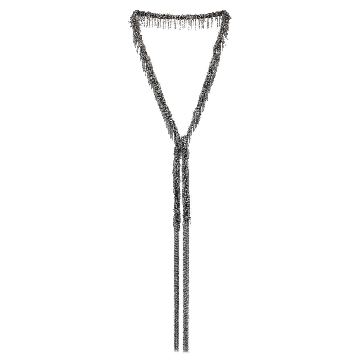 Long open necklace embroidered on a soft dark grey metallic ribbon with chain fringe.
