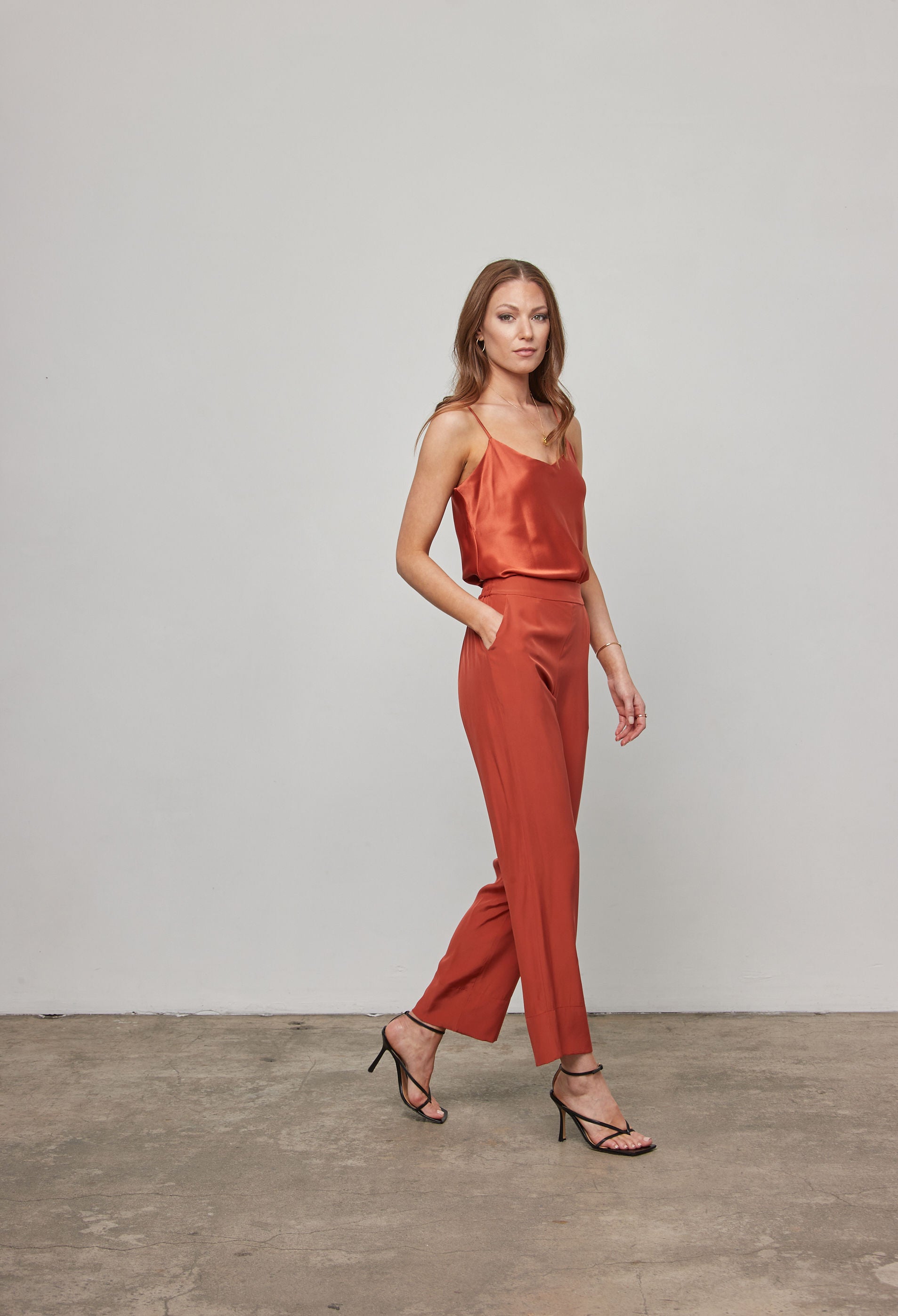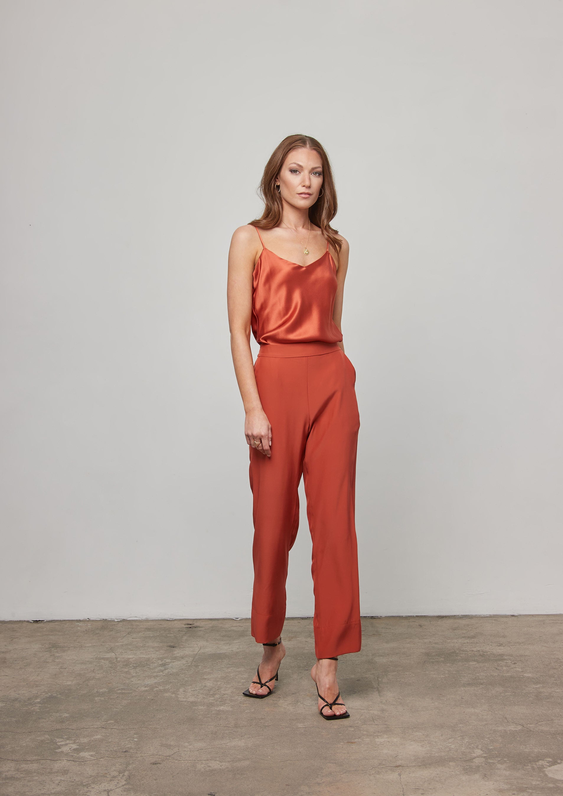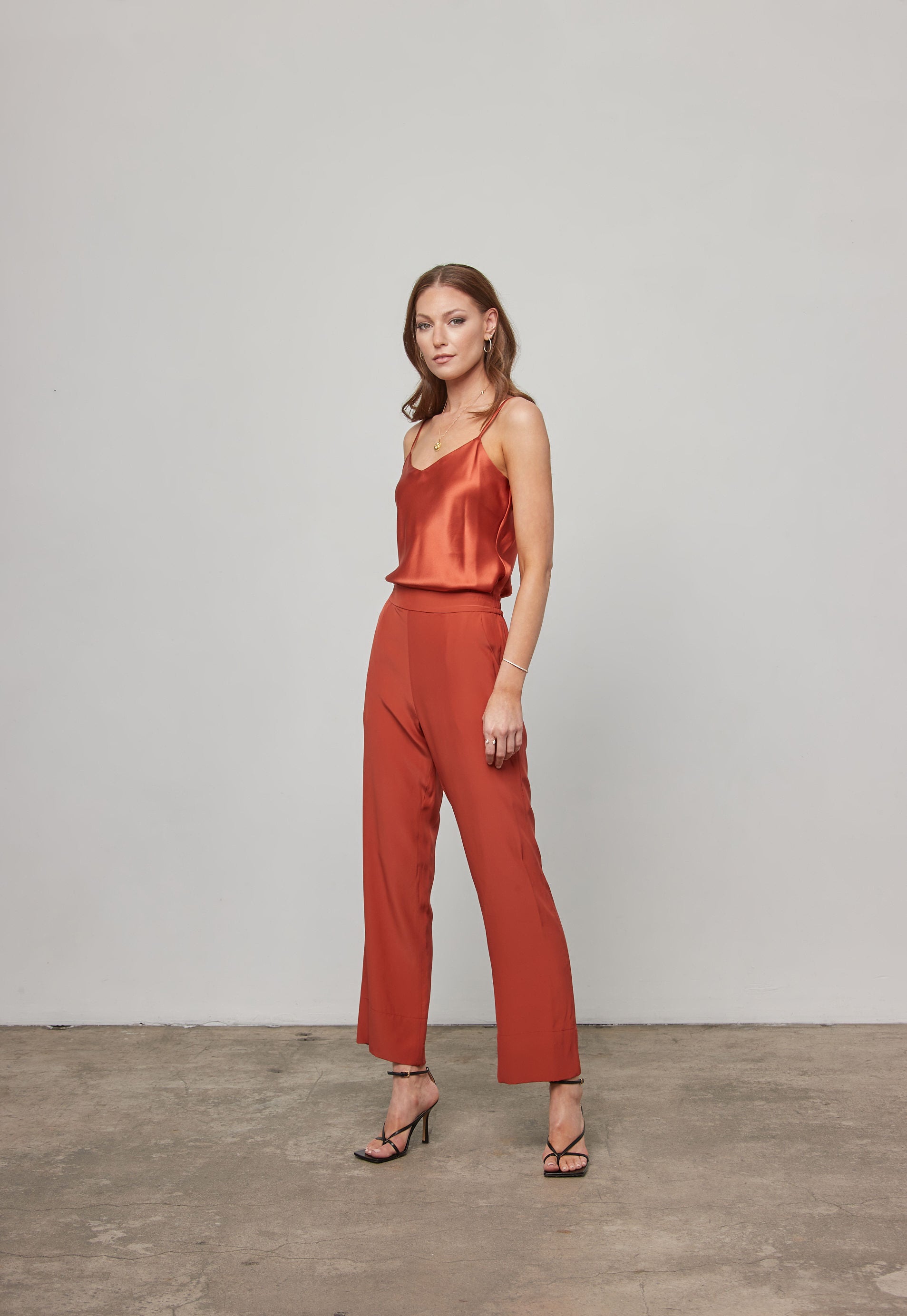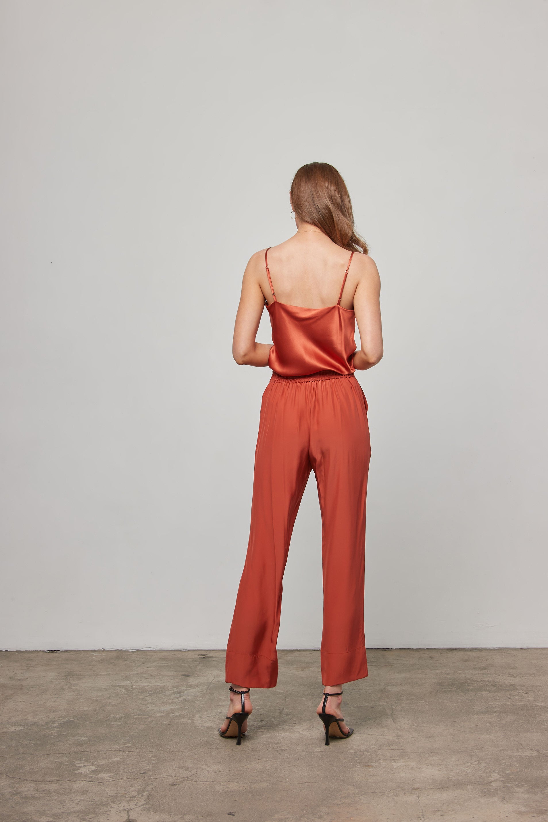 Slip on our coziest pant yet, the Joyce Silk Pant. Made with a flat front detail, elastic waist in back and two pockets, these are the easiest pants you'll own. And we've delivered in three gorgeous colors - vibrant rust, rich emerald and classic black.