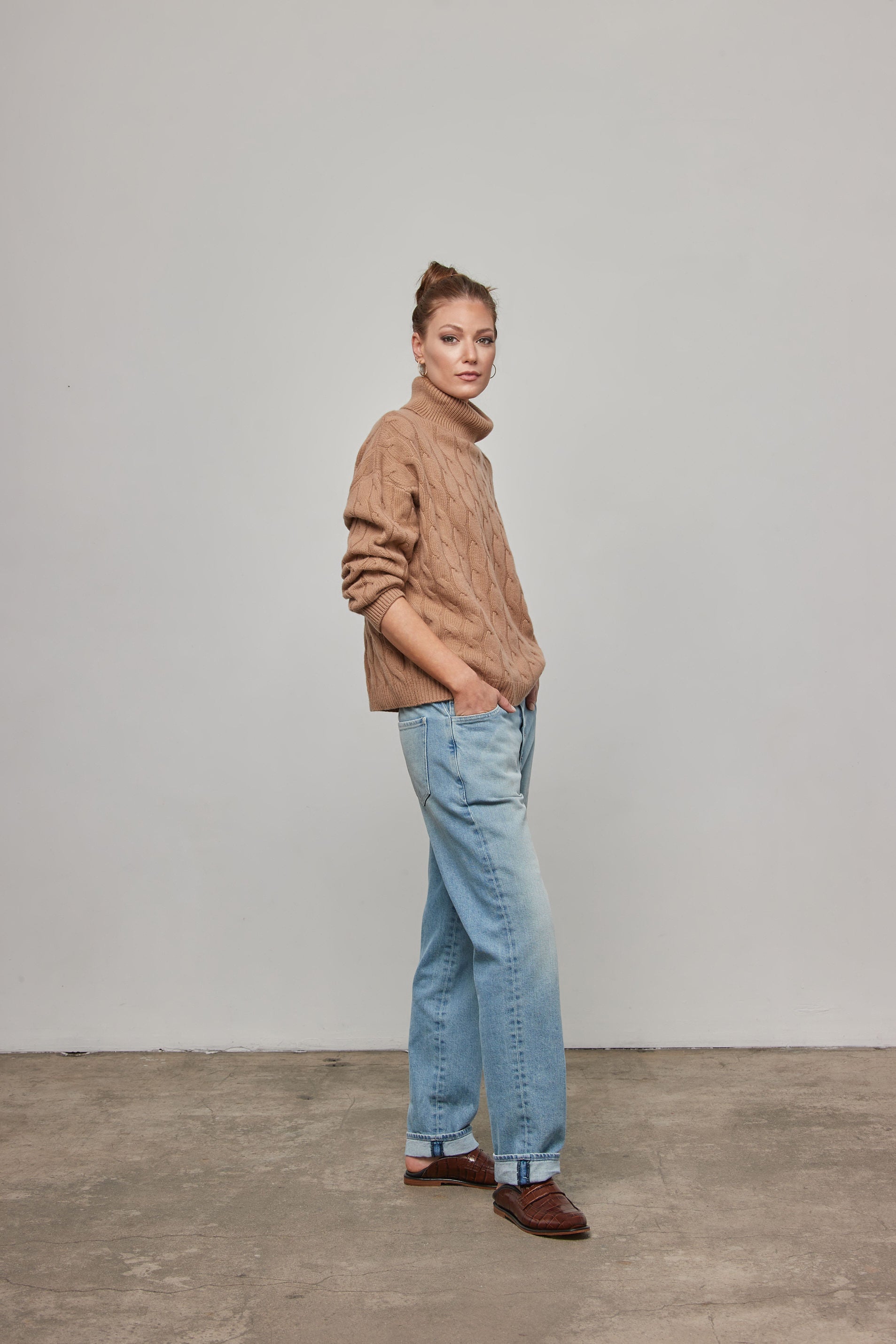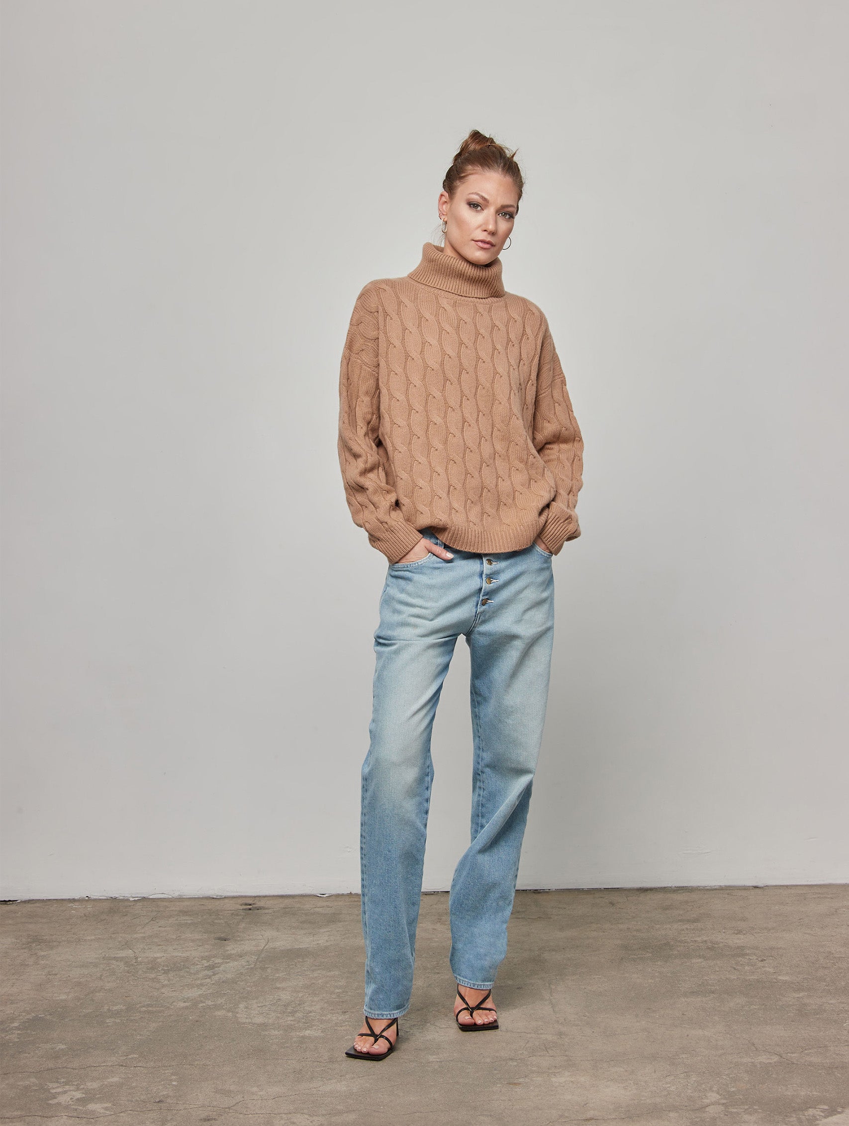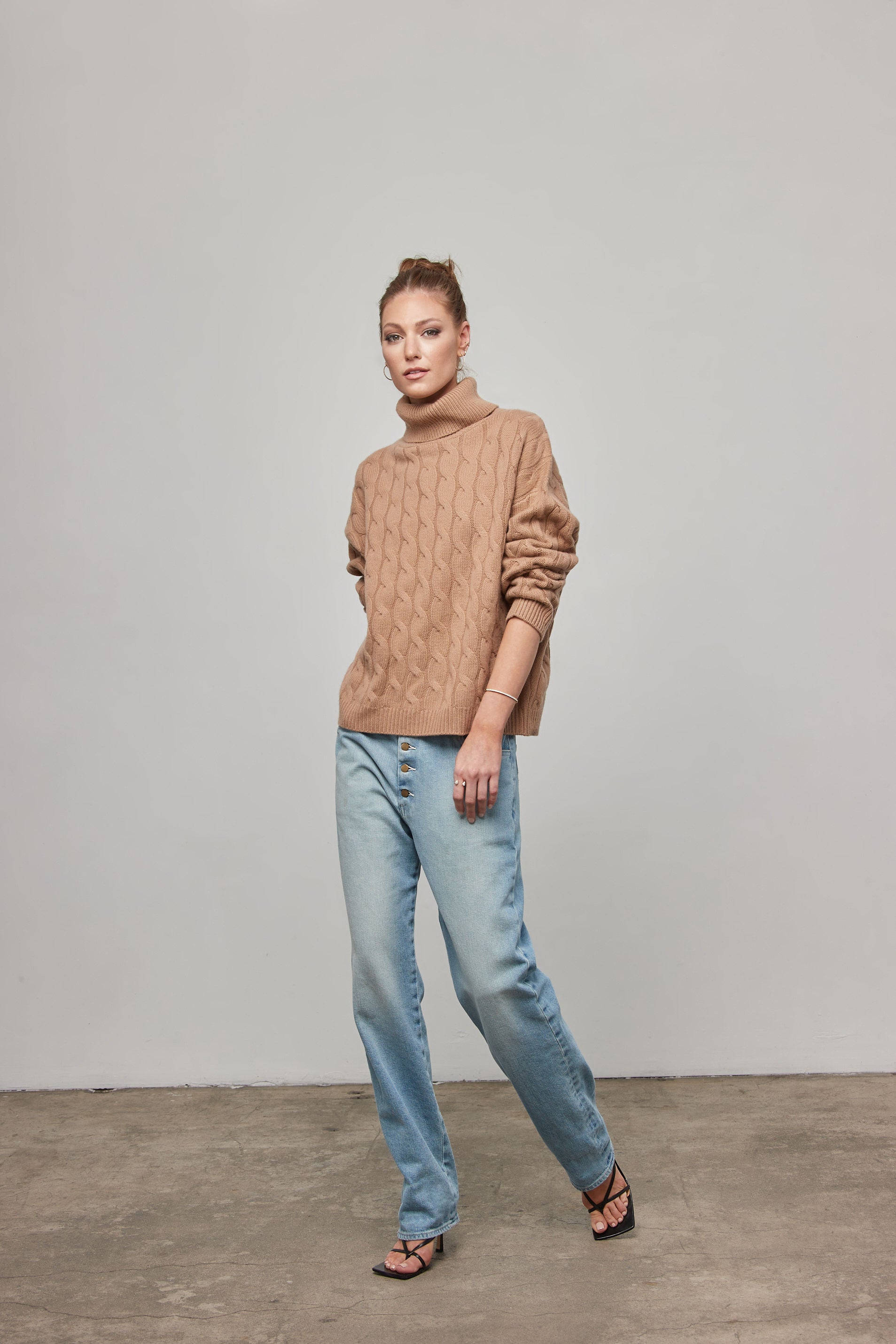 Get cozy in the Catherine Cashmere Turtleneck. Made of 100% cashmere with a cable knit design, this roomy sweater is perfect with a pair of jeans or over your favorite silk slip dress or skirt.