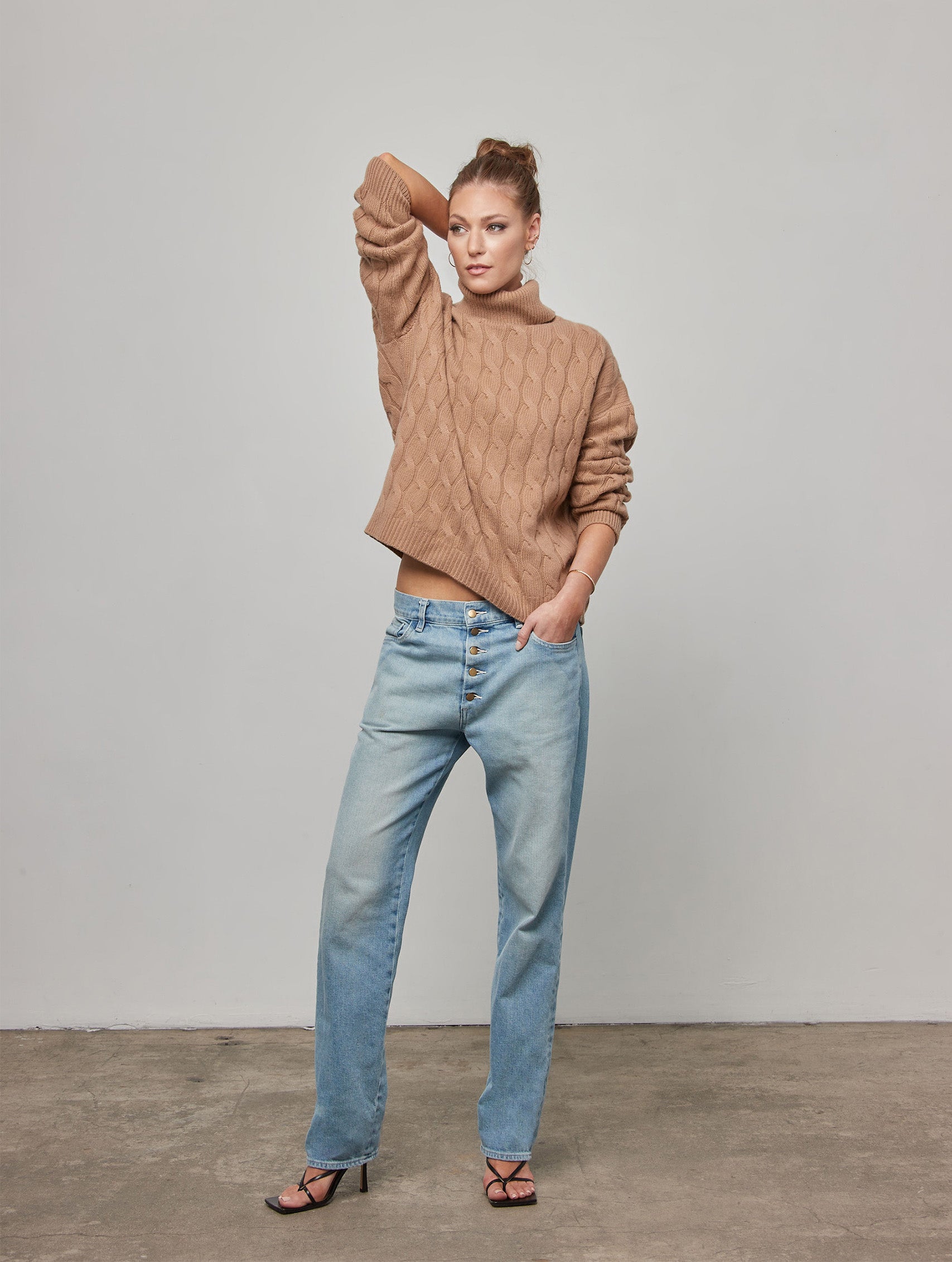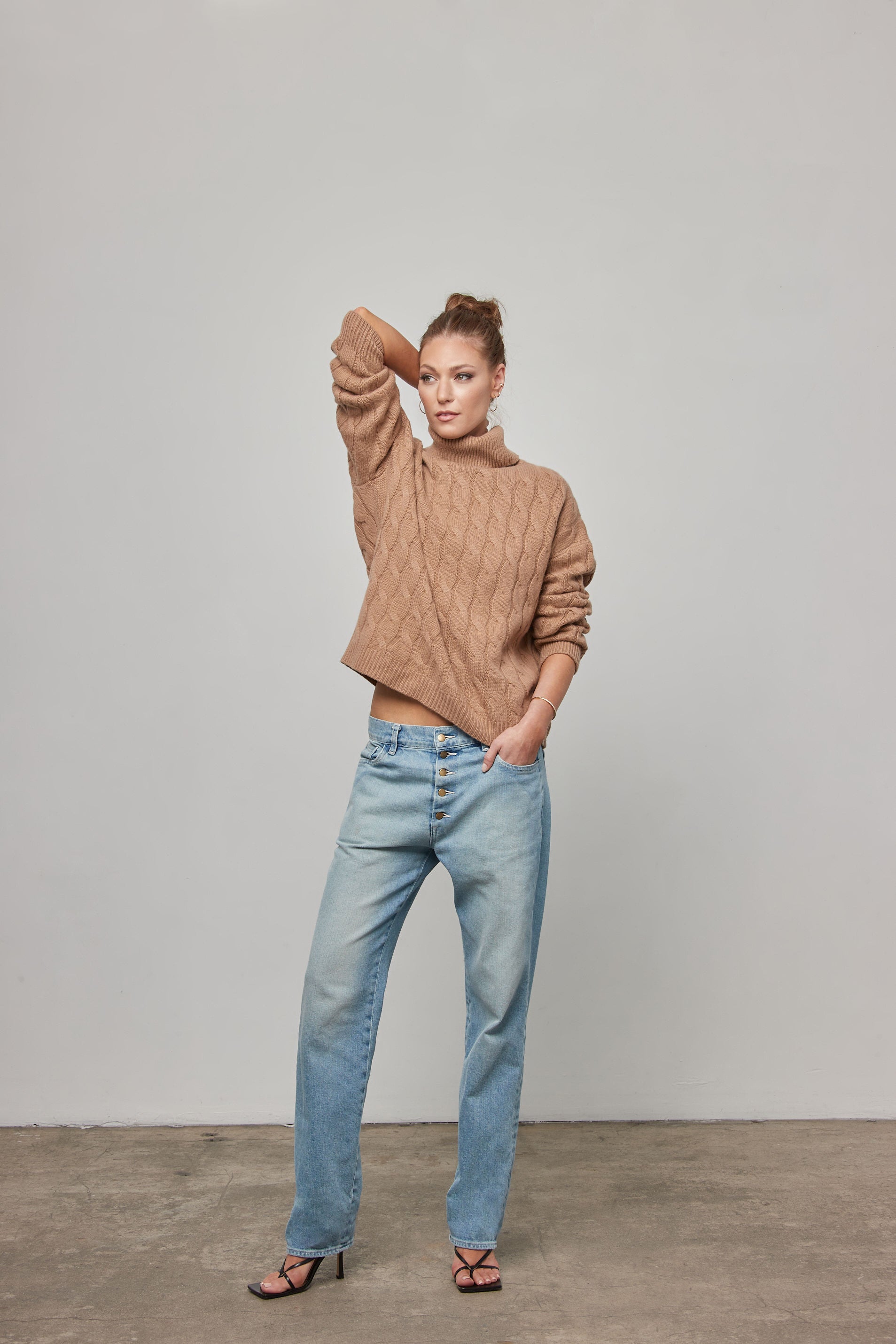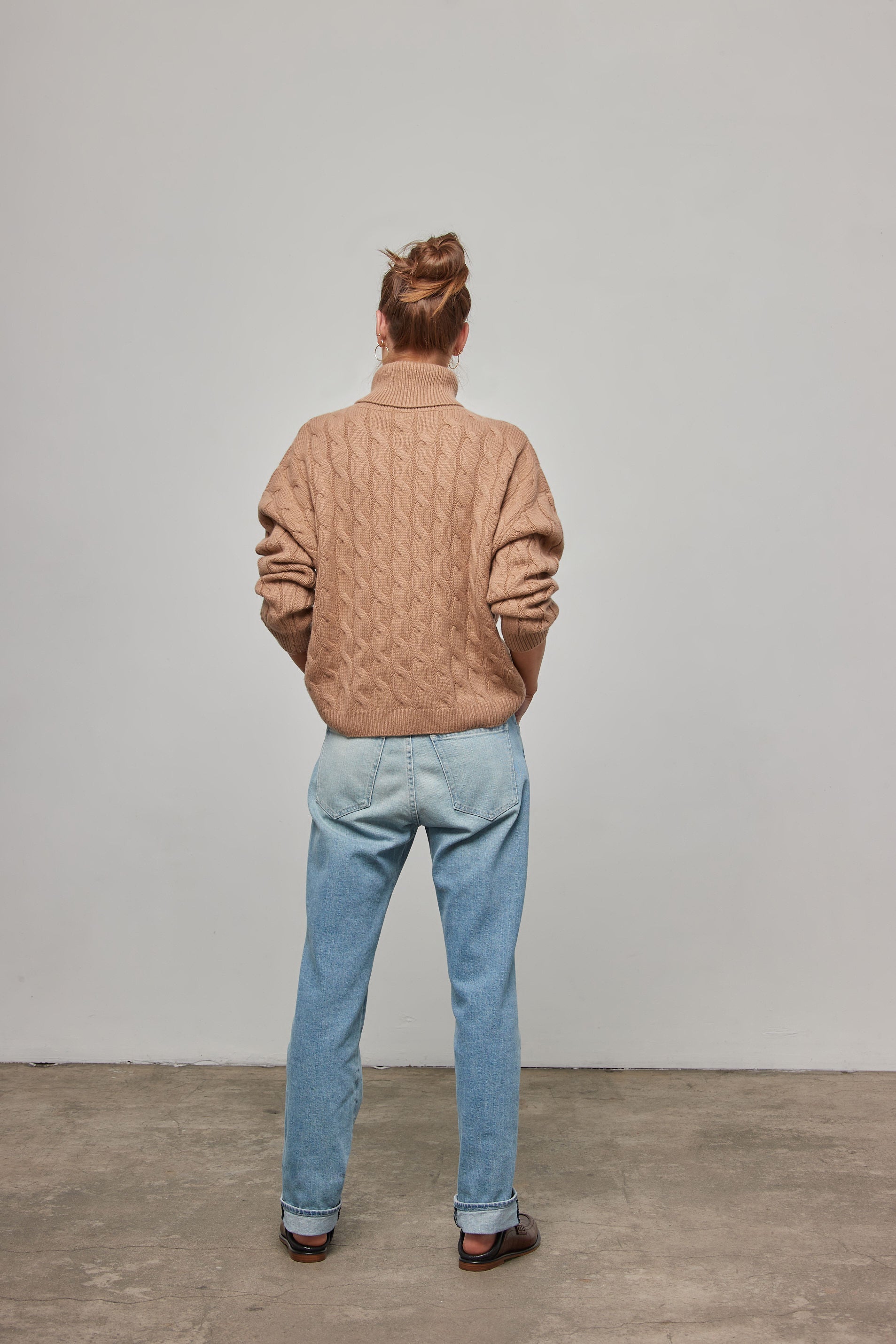 Get cozy in the Catherine Cashmere Turtleneck. Made of 100% cashmere with a cable knit design, this roomy sweater is perfect with a pair of jeans or over your favorite silk slip dress or skirt.